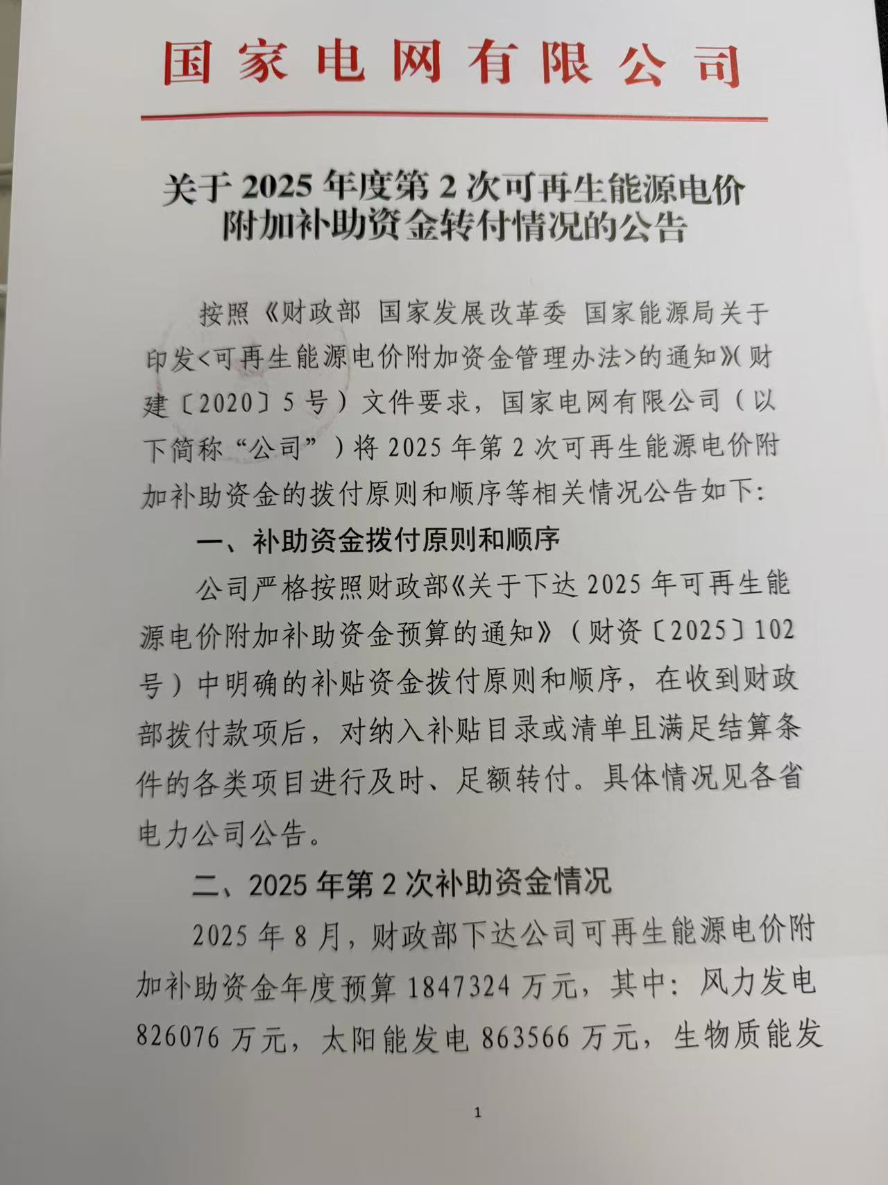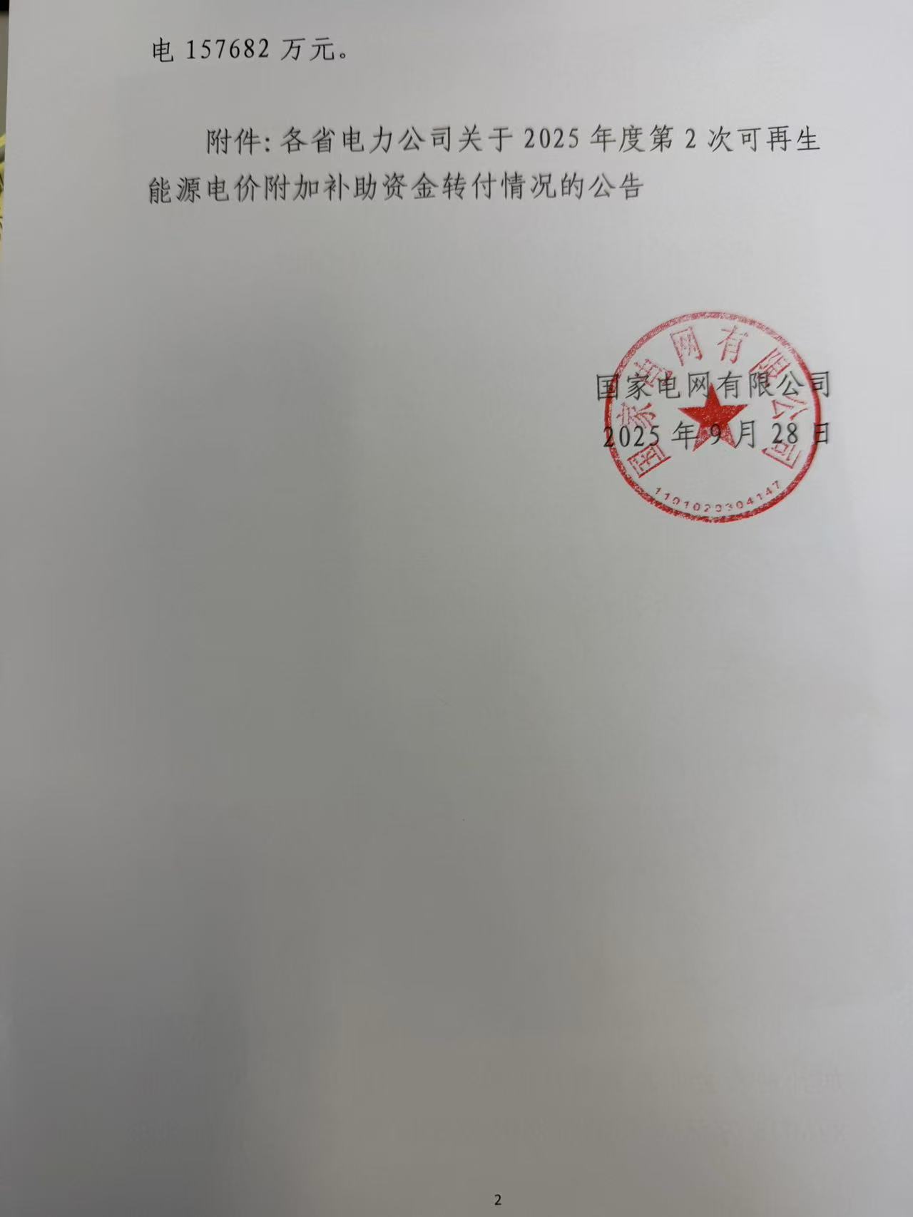 9月26日國家電網發布2025年度第2次可再生能源電價附加補助資金轉付情況的公告。