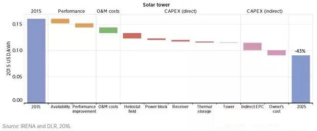 圖:塔式光熱電站2025年之前的成本下降曲線(數(shù)據(jù)來自IRENA 2016年發(fā)布的報告)