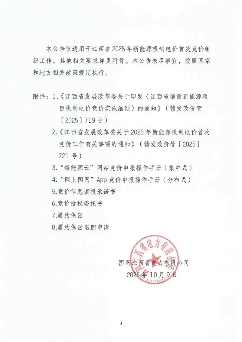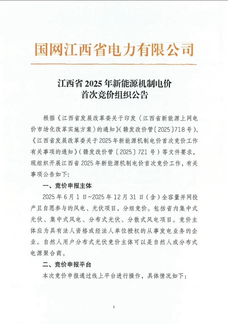 10月9日, 國網江西省電力有限公司發布2025年新能源機制電價首次競價組織公告。全文如下: