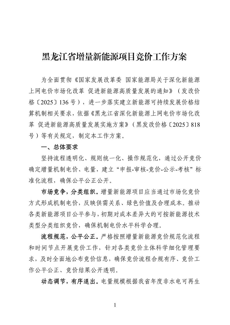 10月11日, 黑龍江發布《黑龍江省增量新能源項目競價工作方案》及《2025-2026年度新能源項目競價》公告。